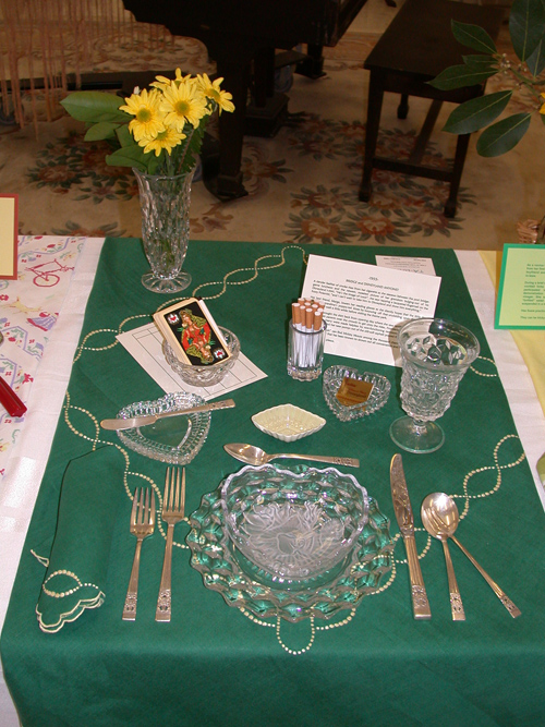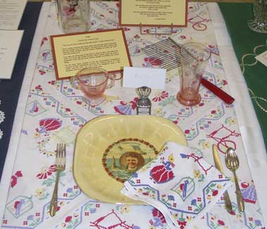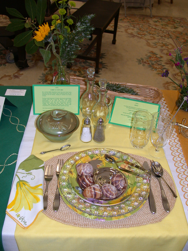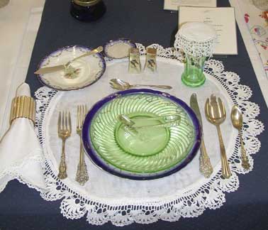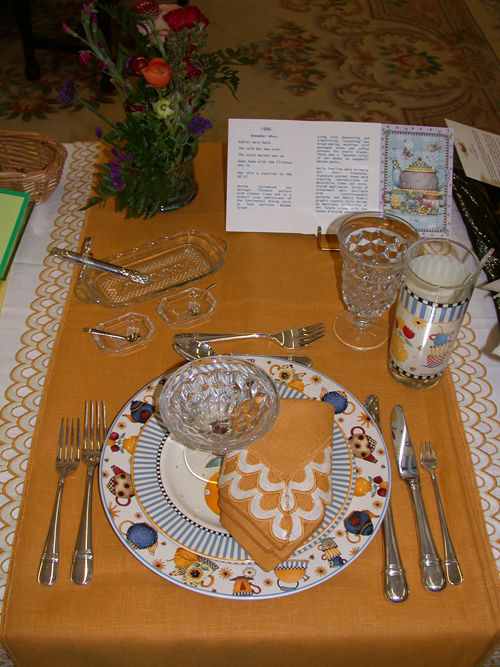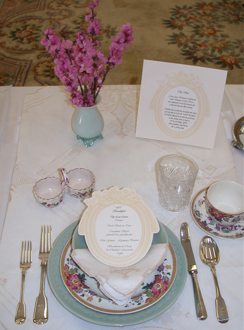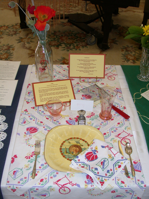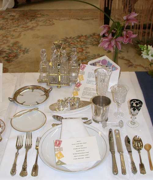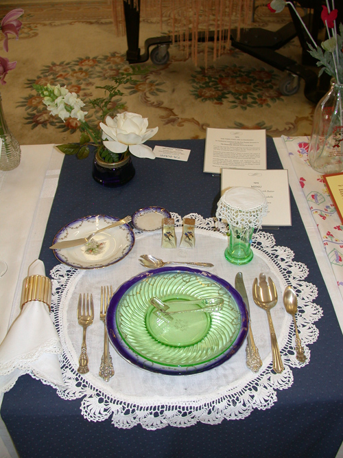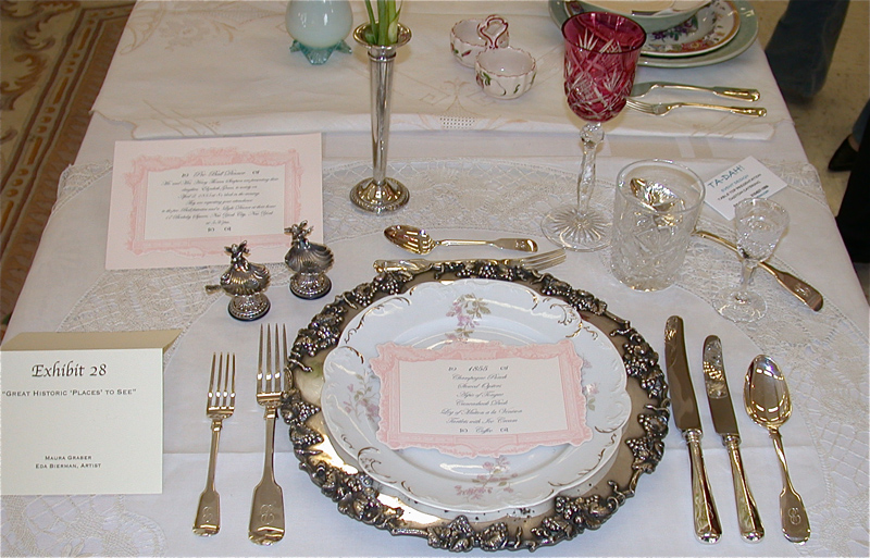 These historically accurate place settings, from 1855 to 2005, were created by Maura Graber and Theme Event Designer Eda Bierman. The nine "Great Historic Places to See" along with their accompanying stories and menus, were shown at the "Designs for Dining" fundraiser held yearly in Palos Verdes Estates. | |