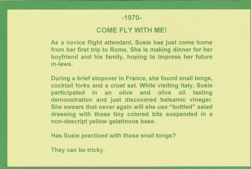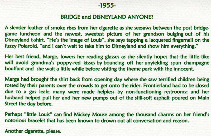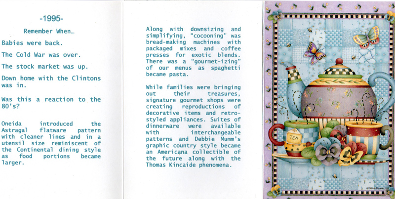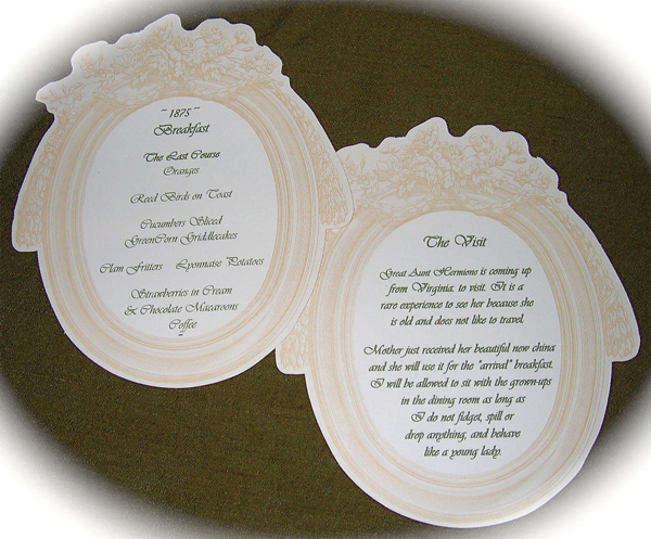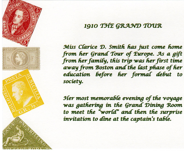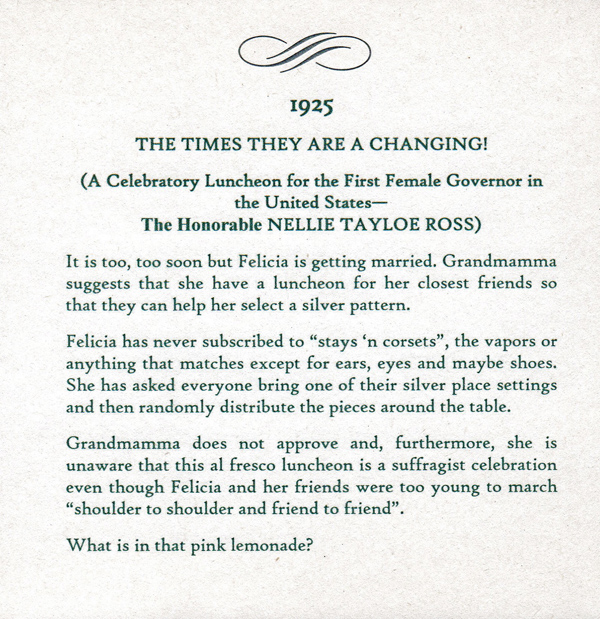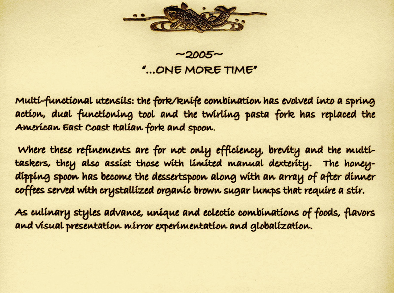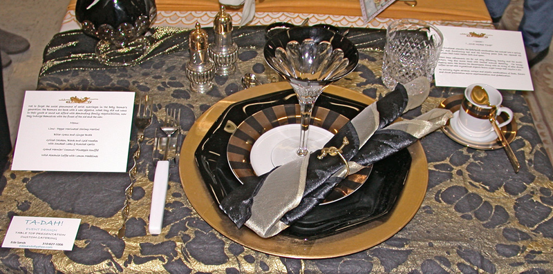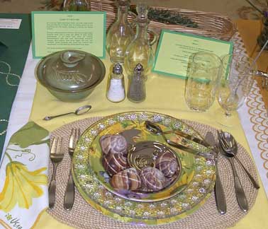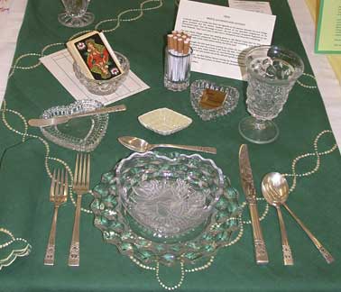 These historically accurate place settings, from 1855 to 2005, were created by Maura Graber and Theme Event Designer Eda Bierman. The nine "Great Historic Places to See" along with their accompanying stories and menus, were shown at the "Designs for Dining" fundraiser held yearly in Palos Verdes Estates. | |